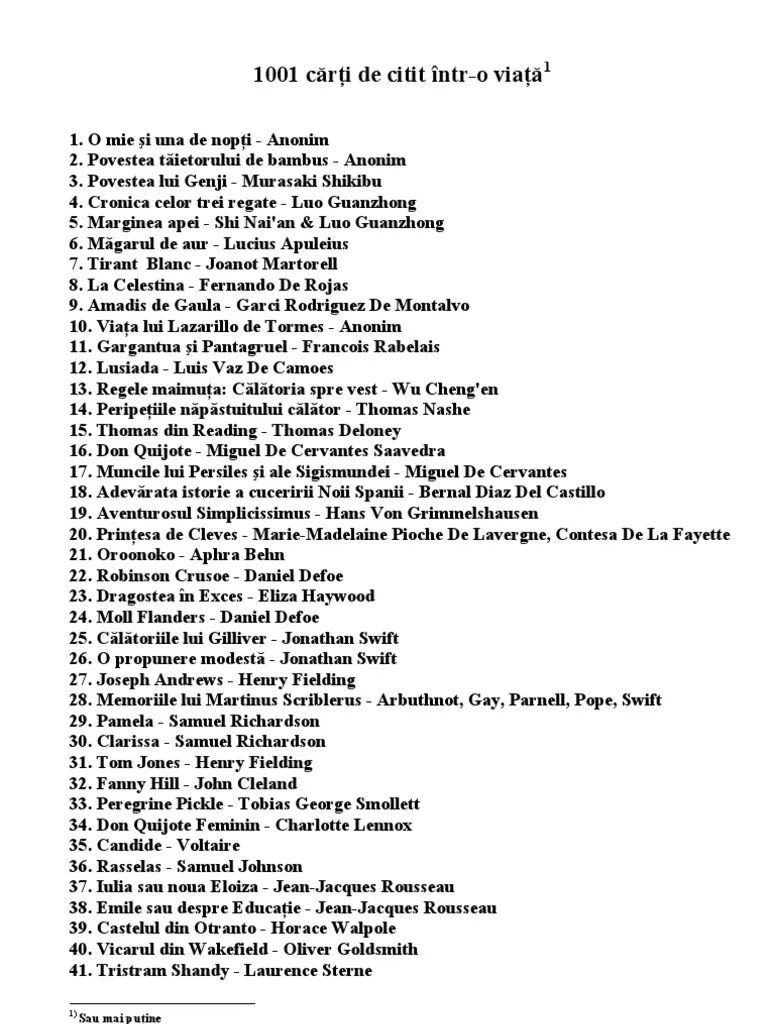 1001 Carti De Citit Intr-O Viata Lista. Fiecare lucrare de literatura prezentata aici este o cheie a lucrarii originale pentru intelegerea si aprecierea cuvantului scris. 11/01/2020 · ce contine acest articol: Lucrarile prezentate au fost alese de o echipa de critici.