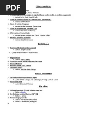 Medlibris.ro catalog carti medicina 2018 pdf.. Alimentatie (233) atlase medicale (42) bioterapie (83) bolile pe intelesul tuturor (140) cadre medii (183) carti de oftalmologie (14) cresterea copilului (284) dictionare medicale (24) farmacie (62) imagistica medicala (75) medicina generala (134) medicina naturista (272) medicina pentru toti (231) specialitati chirurgicale (389) chirurgie cardiaca (24. 28.05.2015 · de fiecare data cand gasesc, navigand pe internet, o biblioteca online gratis cu carti online pdf care imi plac, o pastrez in notitele mele pentru a o recomanda. In aceasta sectiune am adunat foarte multe carti gratuite. A medicina na atualidade vai a passos largos, e é por isso que queremos compartilhar com vocês nossa seleção de livros de medicina em formato pdf, totalmente grátis. Structurată în 11 secÅ£iuni care cuprind 60 de capitole. Cauti carti pdf gratis in limba romana online? Toate aceste carti le puteti citi online, le puteti downloada (in format pdf) sau le puteti trimite prietenilor dvs prin email sau prin retelele sociale (facebook, twitter, etc), puteti adauga comentarii, etc. 👉 cărÅ£ile te vindecă de oameni, iar oamenii de cărÅ£i. Ler é mais do que um ato recreativo, e aqueles que recebem nossos livros grátis para se dedicarem ao estudo ou à revisão de assuntos como medicina o demonstram.. Este absolut impresionanta, are cele mai.