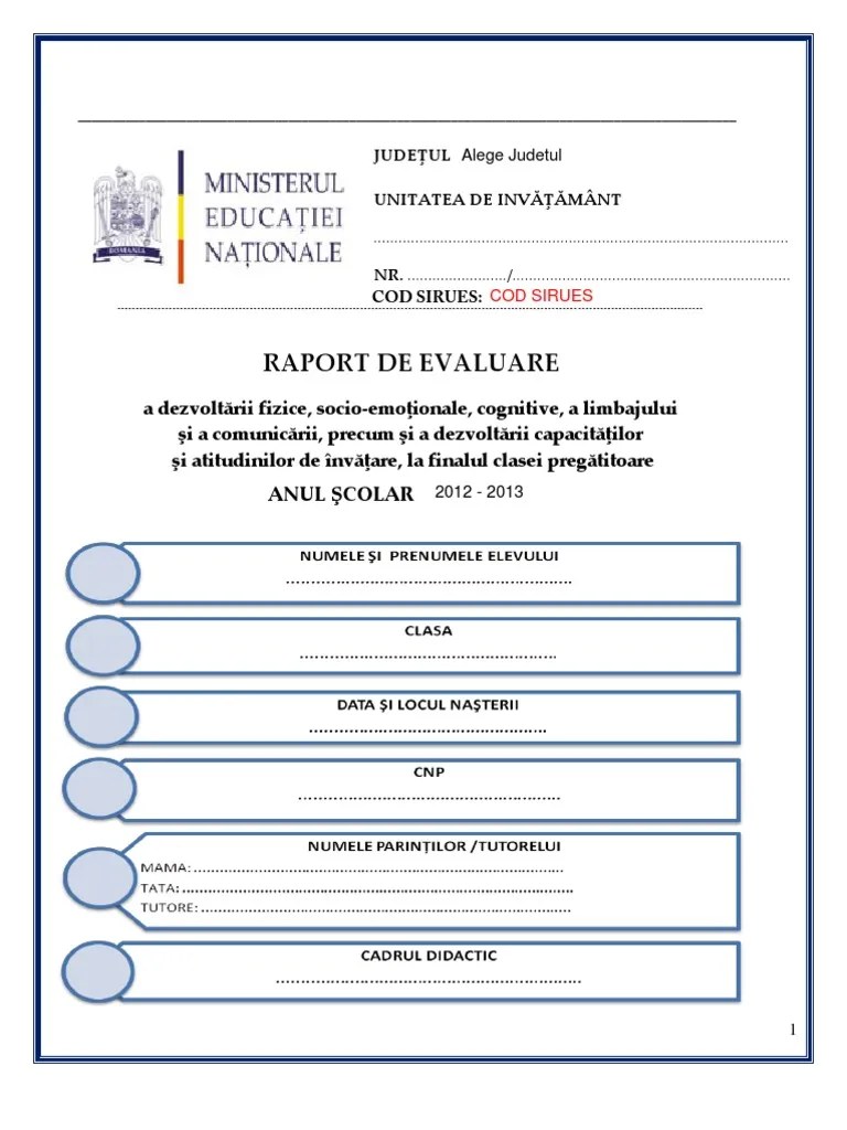 Lista de documente disponibile pentru a fi descarcate:.. Scopul întocmirii raportului de evaluare, la finalul clasei pregătitoare, îl reprezintă. Nu imi este clar ce trebuie sa contina rubrica aprecieri si recomandari finale. Un material foarte util pentru evaluarea la finalul clasei pregatitoare. Ministerul educaţiei cercetării şi inovării. 4 stele | 1 review.. Raportul de evaluare pentrtu clasele pregatitoare, romana sdi minoritati, modificat in format word pentru a gfi mai usor de completat raport clasa pregatitoare 2019.